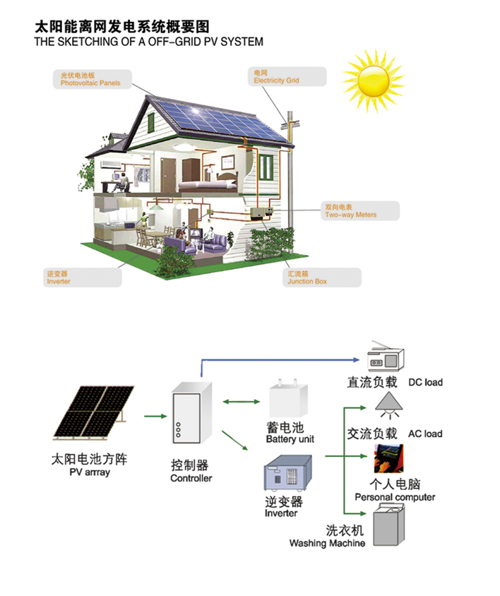 太陽能離網(wǎng)發(fā)電系統(tǒng)為您提供一切所需的生活用電,特別適用于無電山村、學(xué)校、醫(yī)院、私人住宅、邊防海島、部隊(duì)及野外作業(yè)等。