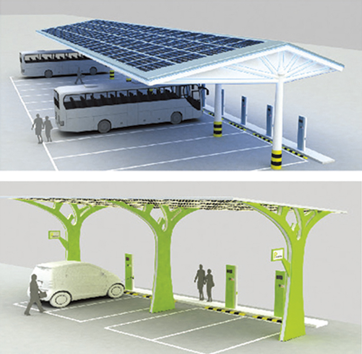 太陽(yáng)能充電站配有太陽(yáng)能光伏發(fā)電系統(tǒng)和蓄電設(shè)備,蓄電設(shè)備主要是蓄電池,太陽(yáng)能發(fā)的電儲(chǔ)存在蓄電設(shè)備中,通過(guò)逆變器輸出交流220V的電壓,并結(jié)合電動(dòng)車充電機(jī)即可完成對(duì)電動(dòng)車的充電。